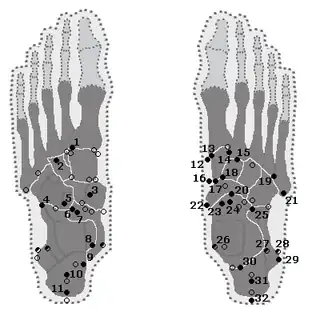 ![]() Localización de los huesos accesorios (sesamoideos ) del pie humano. | ||