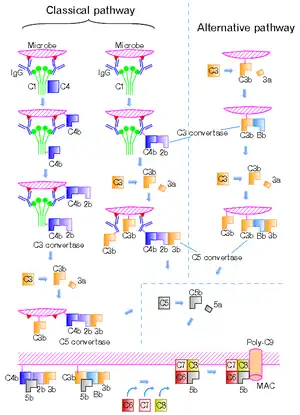 Cuando C1 reconoce a un antígeno marcado con un anticuerpo se inicia la llamada vía clásica de activación del complemento que culmina con la escisión de C5 en C5a y C5b, y la activación del complejo de ataque a la membrana.