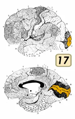El área visual lleva el nombre de "corteza estriada", porque deriva de la estría de Gennari, una banda distintiva visible a simple vista y el único marcador anatómico que indica el área visual primaria.