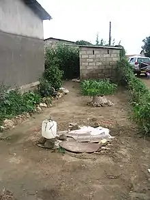 Una letrina de hoyo bien mantenida en un hogar rural cerca de Maseru, Lesoto.