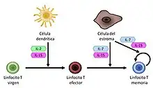 Inicialmente para su activación y expansión clonal las células vírgenes necesitan de la IL-2 y la IL-15 proporcionada por las células dendríticas durante la presentación del antígeno. Una vez las células efectoras realizan su función, la mayoría mueren por apoptosis. Sin embargo, pueden evitarlo mediante citocinas de supervivencia que además median su transformación a célula de memoria. La más importante de ellas es la IL-7[7] secretada de forma constitutiva por las células estromales, lo que explica la alta concentración de su receptor (CD127) en la superficie; pero también interviene la IL-15. Ambas citocinas estimulan la expresión de proteínas antiapoptóticas e inducen una ligera proliferación.[8]