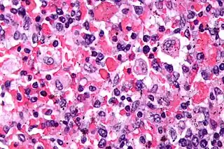 ![]() Microfotografia de la muestra de tejido de un paciente afectado por linfohistiocitosis hemofagocítica. | ||