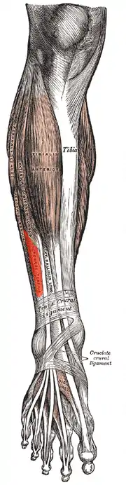 ![]() A la izquierda en color rojo brillante puede observarse el músculo peroneo anterior. | ||