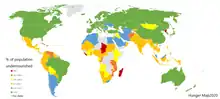 | Porcentaje de la población mundial malnutrida[44][45] | 37 % | 28 % | 20 % | 16 % | 17 % |