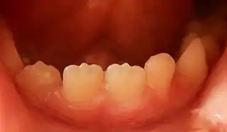 ![]() Mamelones en los incisivos inferiores centrales y laterales derechos de un niño de siete años. | ||