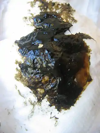 El meconio es una sustancia viscosa y espesa de color verde oscuro a negro compuesta por células muertas y secreciones del estómago e hígado, que reviste el intestino del recién nacido. Su formación comienza en el periodo fetal.[1] Son las primeras heces. El término meconio, que denomina la materia fecal que se acumula en el colon fetal durante la gestación, deriva de la palabra griega mekoni, que significa jugo adormecedor u opio. Desde que Aristóteles observara una relación entre la tinción por meconio del líquido amniótico y un estado de sueño fetal o la depresión neonatal, los obstetras se han interesado por el bienestar del feto cuando se presenta meconio en el líquido amniótico.[2]