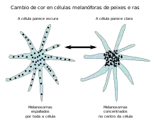 Los melanosomas que se encuentran en ciertas especies de peces contienen pigmentos que controlan el color de las escamas de los peces. Los motores moleculares, cuando se les indique, transportarán los melanosomas que contienen pigmentos a la periferia de la célula o los concentrarán en el centro.[10] La proteína motora dineína es responsable de concentrar los melanosomas hacia el centro de la célula, o el "extremo negativo" de los microtúbulos . Por el contrario, la proteína kinesina es responsable de dispersar los melanosomas hacia la periferia de la célula y son motores dirigidos a los extremos. Debido a que los extremos positivos de los microtúbulos están orientados hacia la periferia, la kinesina transportará los melanosomas a la periferia. La dispersión de los melanosomas hacia la periferia hace que la célula parezca más oscura; concentrar los melanosomas hacia el centro hará que la célula tenga un color más claro. Así es como funciona un sistema fotoprotector para los peces a nivel molecular.[10]