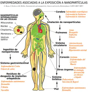 La vía más sencilla de contaminarse con las nanopartículas, al entrar por la nariz, eventualmente van a llegar a los pulmones, en los cuales las nanopartículas van a atravesar el epitelio pulmonar e introducirse al flujo sanguíneo y llegar a otras zonas y órganos. Estas nanopartículas se pueden depositar en cualquier parte de nuestro cuerpo, esto dependerá de su naturaleza química lo cual definirá su afinidad para buscar un sitio donde reaccionar o donde adherirse, su naturaleza química efectuara diferentes daños los cuales pueden ser leves o muy graves.[6]
