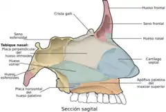 La pared que separa las dos cavidades de la nariz, el tabique nasal, está formada por hueso en el interior y cartílago más cerca de la punta de la nariz.[4] La parte ósea está formada por la placa perpendicular del hueso etmoides en la parte superior y el hueso vómer debajo. El piso de la nariz está formado por el hueso incisivo y las placas horizontales de los huesos palatinos, y esto forma el paladar duro del techo de la boca. Las dos placas horizontales se unen en la línea media y forman la espina nasal posterior que da unión al músculo de la úvula en la úvula.