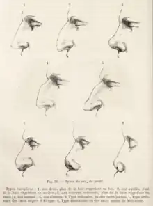 Paul Topinard desarrolló el índice nasal como método de clasificación de grupos étnicos. El índice se basa en la relación entre el ancho de la nariz y su altura.[30] Las dimensiones nasales también se utilizan para clasificar la morfología nasal en cinco tipos: La hiperleptorrina es una nariz muy larga y estrecha con un índice nasal de 40 a 55. La leptorrina describe una nariz larga y estrecha con un índice de 55 a 70. La mesorrina es una nariz mediana con un índice de 70 a 85. Platirrina es una nariz corta y ancha con un índice de 85-99.9. El quinto tipo es la hiperplatirrina que tiene un índice de más de 100.[31]