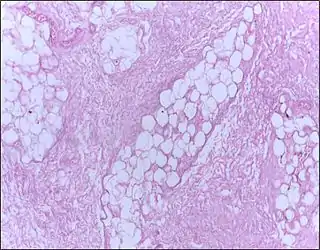 ![]() Micrografía de tejido mamario que muestra necrosis grasa. Tinción Hematoxilina-Eosina | ||