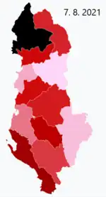 ![]() Casos confirmados por municipios de Albania al 28 de octubre de 2020 1-99 casos confirmados 100–249 casos confirmados 250–499 casos confirmados 500–999 casos confirmados 1000-1999 casos confirmados 2000+ casos confirmados | ||