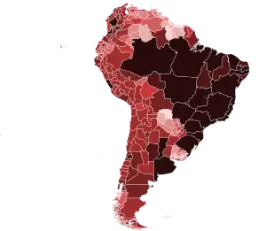![]() Mapa de países de América del Sur con casos confirmados de COVID-19 (Actualizado hasta el 18 de diciembre de 2020): <500 casos confirmados 500–1,000 1,000–2,000 2,000–5,000 5,000–10,000 10,000–50,000 50,000–100,000 100,000–200,000 >200,000 casos confirmados | ||