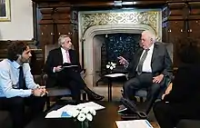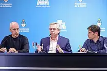 El 15 de marzo, Fernández mencionó que analiza «parar la Argentina por diez días» y recomendó «si se pueden quedar en sus casas, quédense. Si en el trabajo toleran su ausencia, quédense. Todo lo que podamos hacer para evitar circular es mejor porque el virus circula porque circulamos».[137] Hacia la noche, en conferencia de prensa desde la Quinta de Olivos, el presidente Alberto Fernández junto al jefe de Gobierno porteño Horacio Rodríguez Larreta y el gobernador de Buenos Aires, Axel Kicillof, anunció la suspensión de las clases en todo el país, el cierre de fronteras para toda persona extranjera no residente, la licencia laboral y horarios de atención específicos para todos los mayores de 60 años, y la cancelación de actividades no esenciales y de aglomeraciones, hasta el 31 de marzo; justificó las medidas porque «todo indica que tenemos que lograr minimizar la circulación del virus, que tarde lo más posible en convertirse en autóctono» y remarcó «no estamos dando 14 días de vacaciones».[138][139] horas antes de la conferencia la Provincia de La Rioja también suspendió las clases