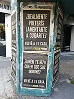 Las medidas sanitarias fueron en general aceptadas por la mayoría de la población, sin perjuicio de una alta preocupación por las consecuencias económicas y sociales de la pandemia, tendiendo a decaer en el tiempo con el hartazgo que genera la situación.[169] Algunos sectores de la población, conocidos como «los anticuarentena», se han mostrado muy críticos frente a la cuarentena y frente a las vacunas, convocando a manifestaciones públicas, "cacerolazos" y actos de desobediencia civil.[170][171] A comienzos de mayo algunos observadores consideraban que en Buenos Aires y otras partes del país, sectores considerables de la población estaban incumpliendo las medidas de aislamiento y distanciamiento en una actitud de "desobediencia civil de hecho", que pudo haber influido en los rebrotes y agravamientos de la pandemia.[172][173][174][175][176]