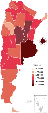 El primer caso confirmado de la pandemia de COVID-19 en Argentina se dio a conocer el 3 de marzo de 2020.[2][3] El 17 de junio de 2021, se confirmaron 4 222 400 casos de personas infectadas y 87 789 muertes en total.[1][4] El 29 de diciembre de 2020 comenzó la campaña de vacunación. El gobierno ha estimado en 23/24 millones la población a ser vacunada.[5] Hacia el 20 de febrero de 2022, 40 197 226 personas habían recibido una dosis, representando el 88,59 % de la población total del país, mientras que 36 057 523 personas, el 79,46 % de la población total, recibieron dos dosis.[6] Además, 12 981 098 personas recibieron una tercera dosis (Adicional o Refuerzo), representando el 28,61 % de la población.