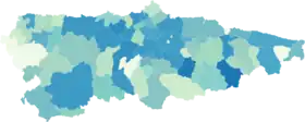 ![]() Casos confirmados de COVID-19 per cápita en Asturias por municipios a fecha de 6 de octubre de 2020. | ||