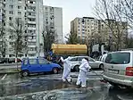 De arriba abajo de izquierda a derecha: Transporte público con señalización, centro comercial en Bucarest cerrado por la pandemia, personal desinfectando las calles, anuncio que indica mantener el distanciamiento social y calles sin circulación por la cuarentena en Bucarest. | ||||||||
