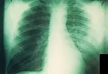 La peste neumónica tiene dos formas, primaria y secundaria, frecuentemente mortales y potencialmente contagiosas para los contactos cercanos.[48][49] Es más común la secundaria, causada por la diseminación hematógena de la bacteria desde el bubón u otra fuente. Aproximadamente el 10 % de los enfermos de peste en los Estados Unidos desarrollan peste neumónica secundaria, habitualmente por el retraso en el tratamiento de la forma bubónica. Comienza como un proceso intersticial con tos productiva y esputo escaso, que normalmente comienza cinco o seis días después de los primeros síntomas. La radiografía de tórax revela infiltrados alveolares difusos casi siempre bilaterales y acompañados de derrame pleural.[50] Sin tratamiento, el esputo se vuelve más copioso y, finalmente, sanguinolento; la muerte ocurre frecuentemente a los tres o cuatro días.[4]