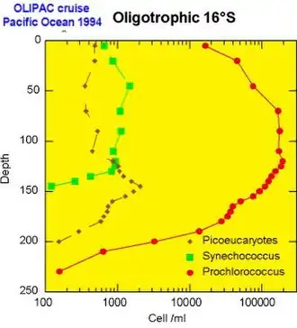- Cyanobacteria del género Prochlorococcus que son particularmente notables. Tamaño típico de 0,6 µm, Prochlorococcus fue descubierta recién en 1988[7] por dos investigadores estadounidenses, Sallie W. Chisholm (Massachusetts Institute of Technology) y por R.J. Olson (Institución Oceanográfica de Woods Hole). A pesar de su minúsculo tamaño, este organismo fotosintético es indudablemente el más abundante del planeta: en verdad su densidad puede llegar a 100 millones de células/L y puede ser hallada a profundidades de más de 150 m en todo el cinturón intertropical.[14]