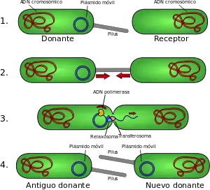 En general, solo suele haber de uno a dos pili presentes en la bacteria. Un pilus sexual interconecta dos bacterias de la misma especie o de especie diferente construyendo un puente entre ambos citoplasmas. Esto permite la transferencia de información genética, ya sea que se trate de un plásmido o de una fracción del cromosoma circular de la bacteria (en este caso, la fracción del cromosoma transferido debe realizarse a través de un plásmido igualmente). El intercambio de plásmidos puede añadir nuevas características a la bacteria, por ejemplo, resistencia a los antibióticos o la capacidad para digerir su medio de manera más eficaz. Algunos bacteriófagos se unen a los receptores de los pili sexuales al comienzo de su ciclo reproductivo.