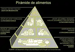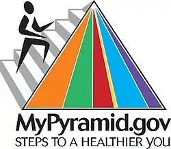 Aunque las primeras pirámides alimenticias fueron creadas a comienzos de la década de 1970, posiblemente la más conocida es la versión introducida por el Departamento de Agricultura de los Estados Unidos en 1992, (revisada y actualizada en 2005, como "MyPyramid"), mostró la importancia del ejercicio físico, y que fue, a su vez, posteriormente sustituido por MiPlato (MyPlate) en 2011.[1]