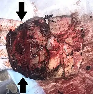 ![]() Patología macroscópica de intervillositis severa, con tejido rojo oscuro y húmedo. | ||