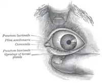 La plica semilunaris es un pliegue pequeño de la conjuntiva bulbar en el canto interno del ojo. Funciona durante el movimiento de los ojos, ayudando a mantener el drenaje lagrimal a través del saco lagrimal, y permitiendo una mayor rotación del globo ocular, ya que sin la plica la conjuntiva se uniría directamente al globo ocular, restringiendo el movimiento.[1] Se trata de un vestigio remanente de la membrana nictitante (el "tercer párpado") que se dibuja a través del ojo de la protección, y está presente en otros animales como aves, reptiles y peces, pero es poco frecuente en los mamíferos, en los que se encuentran principalmente en los monotremas y en los marsupiales.[2] Sus músculos asociados también son vestigiales.[3] No se encuentra fijado, por lo tanto los movimientos oculares no están restringidos por ella. Sólo se sabe de una especie de primates, el calabar arctocebus, en el que tiene este órgano con pleno funcionamiento como membrana nictitante.[4]