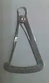 - Calibre o medidor de grosores: Es un instrumento que como su nombre indica sirve para medir el grosor de los metales, básicamente en cofias metálicas (de coronas y puentes), dado que se precisan unos grosores determinados del metal que deberán lograrse durante el repasado del mismo y antes de comenzar con todo el proceso que precede al montaje de la cerámica.