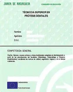 - En España los estudios de Formación Profesional que cursa el protésico dental constituyen un Ciclo formativo de grado superior de la familia profesional Sanidad, más específicamente, del área profesional Salud bucodental, y otorga el título de Técnico Superior en Prótesis Dentales. El ciclo consta de una duración de 2000 horas repartidas en dos cursos con 11 módulos profesionales y un periodo denominado de Formación en Centros de Trabajo (F.C.T.) mediante el que se completa los estudios prácticos realizando actividades propias de la profesión en alguna empresa.[16]