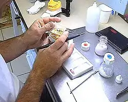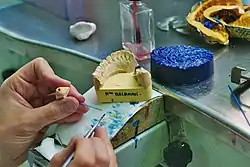 - Articulador: El articulador es un instrumento manual que se usa en el laboratorio protésico para reproducir la articulación temporomandibular del paciente. Existen muy diversos tipos, clasificados según su ajuste, precisión y modelos.[9][10]