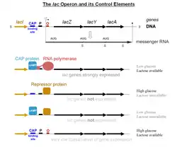 Esto abre la molécula de ADN, permitiendo que la ARN polimerasa se una y transcriba los genes implicados en el catabolismo de la lactosa.[1][2] Así, CAP potencia la expresión del operón lac cuando la lactosa está presente, pero no si hay glucosa.