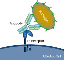 ![]() Diagrama esquemático que muestra la interacción del receptor Fc con un patógeno microbiano recubierto de anticuerpo | ||