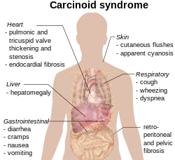 Síndrome carcinoide se refiere al conjunto de signos y síntomas que ocurren secundariamente a un tumor carcinoide.[1] El síndrome incluye rubor, diarrea y, con menor frecuencia, insuficiencia cardiaca y broncoespasmo.[2] Lo causa principalmente la secreción endógena de serotonina y calicreína.
