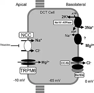![]() Un modelo de mecanismos de transporte en el túbulo contorneado distal. El cloruro de sodio (ClNa) ingresa a la célula a través del NCC apical sensible a las tiazidas y sale de la célula a través del canal basolateral de Cl − (ClC-Kb) y la Na + /K + -ATPasa. También se indican el canal de magnesio TRPM6 identificado en la membrana apical y un supuesto intercambiador de Na/Mg en la membrana basolateral. Estos mecanismos de transporte juegan un papel en la hipopotasemia-hipomagnesemia familiar o síndrome de Gitelman. | ||