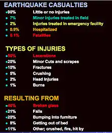 - ↑ Peek-Asa C., Ramírez M., Seligson H. y Shoaf K., “Seismic, structural, and individual factors associated with earthquake related injury”, Inj Prev 2003, 9:62-66.