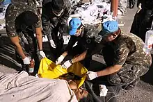 - ↑ El grupo de trabajo denominado Renal Disaster Relief Task Force (RDRTF) es una organización de ayuda humanitaria creada por la Sociedad Internacional de Nefrología (ISN) cuyas misiones siempre tienen lugar en coordinación y con el apoyo logístico de “Médecins Sans Frontières” (MSF, Médicos Sin Fronteras). Ese grupo de trabajo, que consiste en una red mundial de expertos en el manejo de pacientes con insuficiencia renal aguda (IRA) y lesión por aplastamiento, envía nefrólogos voluntarios, intensivistas, enfermeras y técnicos de diálisis para ofrecer alivio después de los terremotos y otros desastres mediante el tratamiento de las víctimas con insuficiencia renal aguda relacionada con lesiones por aplastamiento, el enfoque de otros problemas que afectan a los pacientes con insuficiencia renal como consecuencia de un desastre y la provisión de material, apoyo psicológico y enseñanza.[47] Los voluntarios deben cumplir con una serie de condiciones. El personal local del país afectado y los voluntarios internacionales trabajan juntos con el fin de organizar la respuesta más eficaz a los desastres y salvar tantas vidas como sea posible.[48]