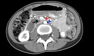 ![]() Tomografía computarizada de abdomen y pelvis que muestra compresión duodenal (flecha negra) por la arteria mesentérica superior(flecha roja) y la aorta abdominal (flecha azul). | ||
