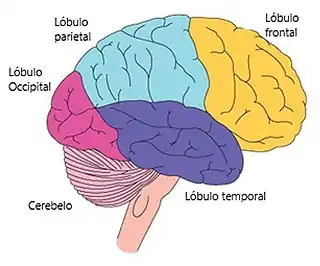 ![]() Ilustración de la vista lateral del cerebro que muestra el lóbulo frontal, otros lóbulos del cerebro y el cerebelo. | ||