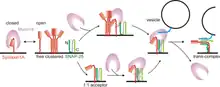 Aunque en un principio se pensaba que la fusión de membranas se iniciaba por la disociación del complejo SNARE mediante el factor sensible a la N-etilmaleimida (NSF), posteriormente se concluyó que es el ensamblaje del complejo lo que constituye el primer paso del proceso, en el que las proteínas v-SNARE y t-SNARE presentes en las dos membranas a fusionar se combinan para formar el complejo trans-SNARE. Durante la fusión, el complejo pasa a adquirir una configuración «cis», en la que todas las proteínas SNARE participantes se encuentran ancladas a la misma membrana. El complejo cis-SNARE es inactivo, y su reciclaje requiere consumo de energía en forma de ATP. El NSF disocia el complejo a través de los cofactores conocidos como SNAP o proteínas de fijación soluble de NSF.[n. 1] Tras la unión de tres moléculas de SNAP, el NSF puede actuar sobre el complejo y posibilitar la disponibilidad de las proteínas SNARE para las reacciones de fusión futuras.[6]