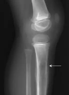 ![]() Rayos X de un niño con sarcoma de Ewing en la tibia | ||