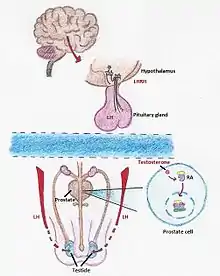 La síntesis de la testosterona se genera mediante una cadena de procesos. Cuando nuestro cuerpo detecta un nivel bajo de testosterona, el hipotálamo empieza a producir HLHL, una hormona que, una vez recibida por la glándula pituitaria, activa la síntesis de (hormona luteinizante) HL. La HL viaja hasta los testículos donde induce la formación de testosterona.[10] Existen dos tratamientos de terapia de privación de andrógenos mediante medicamentos. Uno evita que la glándula pituitaria libere HL y el otro bloquea la capacidad del organismo para usar andrógenos.