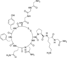 | 1-{[(4R,7S,10S,13S,16S,19R)-19-{[({[(aminoacetil)amino]acetil}amino)acetil]amino}-7-(2-amino-2-oxoetill)-10-(3-amino-3-oxopropil)-13-benzil-16-(4-hidroxibenzil)-6,9,12,15,18-pentaoxo-1,2-ditia-5,8,11,14,17-pentaazacicloicosan-4-yl]carbonil}-L-prolil-N-(2-amino-2-oxoetil)-L-lisinamida | ||