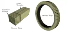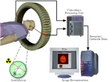 La máquina de PET es muy parecida a la que se utiliza para hacer un TAC. Es una máquina grande con forma de anillo. En el interior se sitúa el paciente en una camilla. Antes de iniciar la prueba hay que administrar al paciente un radiofármaco. Puede ser por vía intravenosa, vía oral o vía inhalada, dependiendo de la sospecha diagnóstica. El tomógrafo PET debe estar diseñado para detectar coincidencias en la emisión de rayos gamma por parte del radiotrazador. El sistema de detección consiste en un conjunto de anillos de detección compuestos por módulos independientes que reciben el nombre de bloques detectores. Cada bloque detector es una estructura matricial de cristales de centelleo acoplada a un número de tubos fotomultiplicadores cuya función es transformar la energía electromagnética en impulsos eléctricos. El cristal de centelleo más utilizado es el germanato de bismuto (BGO). Esta solución de módulos independientes es muy eficiente ya que cada bloque detector cuenta con su propia electrónica, por tanto, mientras un bloque detecta un evento y por tanto es incapaz de registrar otro dentro de esa ventana temporal, el resto de bloques pueden seguir registrando de forma independiente.