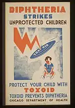 Póster para animar a los padres a vacunar a sus hijos con el toxoide de la difteria.