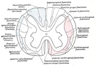 ![]() Esquema de los principales fascículos de la médula espinal. (Fascículo vestibuloespinal marcado en la parte inferior derecha). | ||