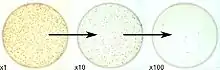 El conteo de placas es lineal para E. coli sobre el rango de 30 - 300 CFU en una placa Petri de tamaño estándar.[10] Por lo tanto, para garantizar que una muestra produzca UFC en este rango se requiere diluir la muestra y aplicar varias diluciones. Normalmente se utilizan diluciones diez veces más diluidas, y la serie de diluciones se platea en réplicas de 2 o 3 sobre el rango de diluciones elegido. La CFU/placa se lee de una placa en el rango lineal, y luego la CFU/g (o CFU/mL) del original se deduce matemáticamente, factorizando la cantidad y su factor de dilución.