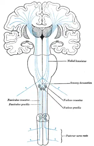 La vía dorsal-lemniscal medial está formada por los axones de las neuronas sensoriales de primer, segundo y tercer orden, que comienzan en los ganglios de la raíz dorsal. Los axones de las neuronas de primer orden forman los tractos ascendentes del fascículo grácil y el fascículo cuneado, que sinaptan con las neuronas de segundo orden en el núcleo grácil y el núcleo cuneado, conocidos conjuntamente como núcleos de la columna dorsal; Los axones de estas neuronas ascienden en forma de fibras arqueadas internas; las fibras se cruzan en la decusación sensorial y forman el lemnisco medial que conecta con el tálamo;[3] los axones hacen sinapsis en neuronas del grupo nuclear ventral que, a su vez, envían axones a la circunvolución postcentral del lóbulo parietal.