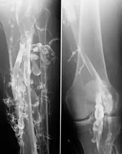 ![]() Flebografía en un paciente con trombosis venosa profunda. | ||
