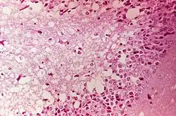 ![]() Fotografía de tejido cerebral de ratón después de morir de Encefalitis Venezolana. Presenta necrosis neural y edema. | ||